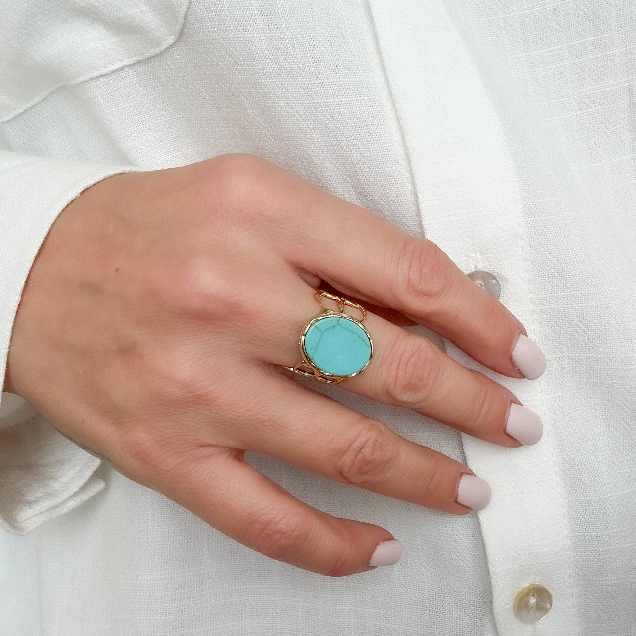 - Bague ajustable composée d'une pierre naturelle ovale plate sur un anneau en forme de maille ovale ajourée.