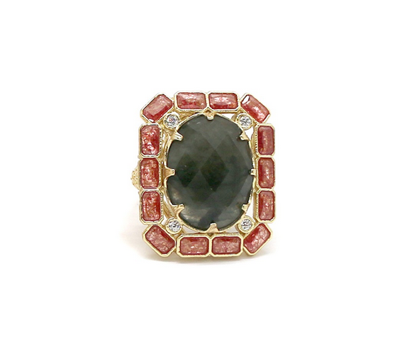 - Bague ajustable composée d'un cabochon en pierre naturelle entouré de strass et de cristaux