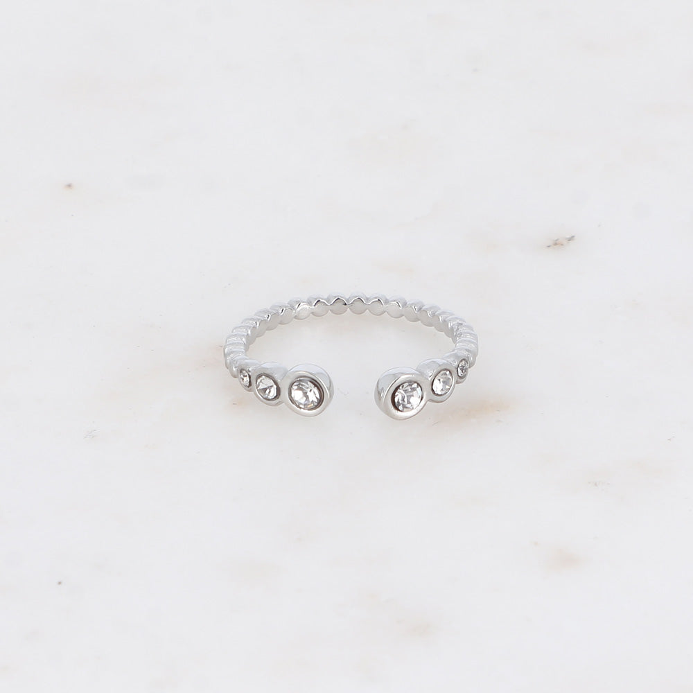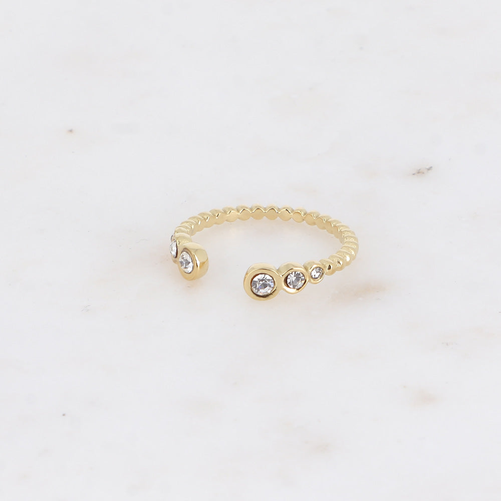 - Bague composée d'un anneau à boules et de petits cristaux aux extrémités.