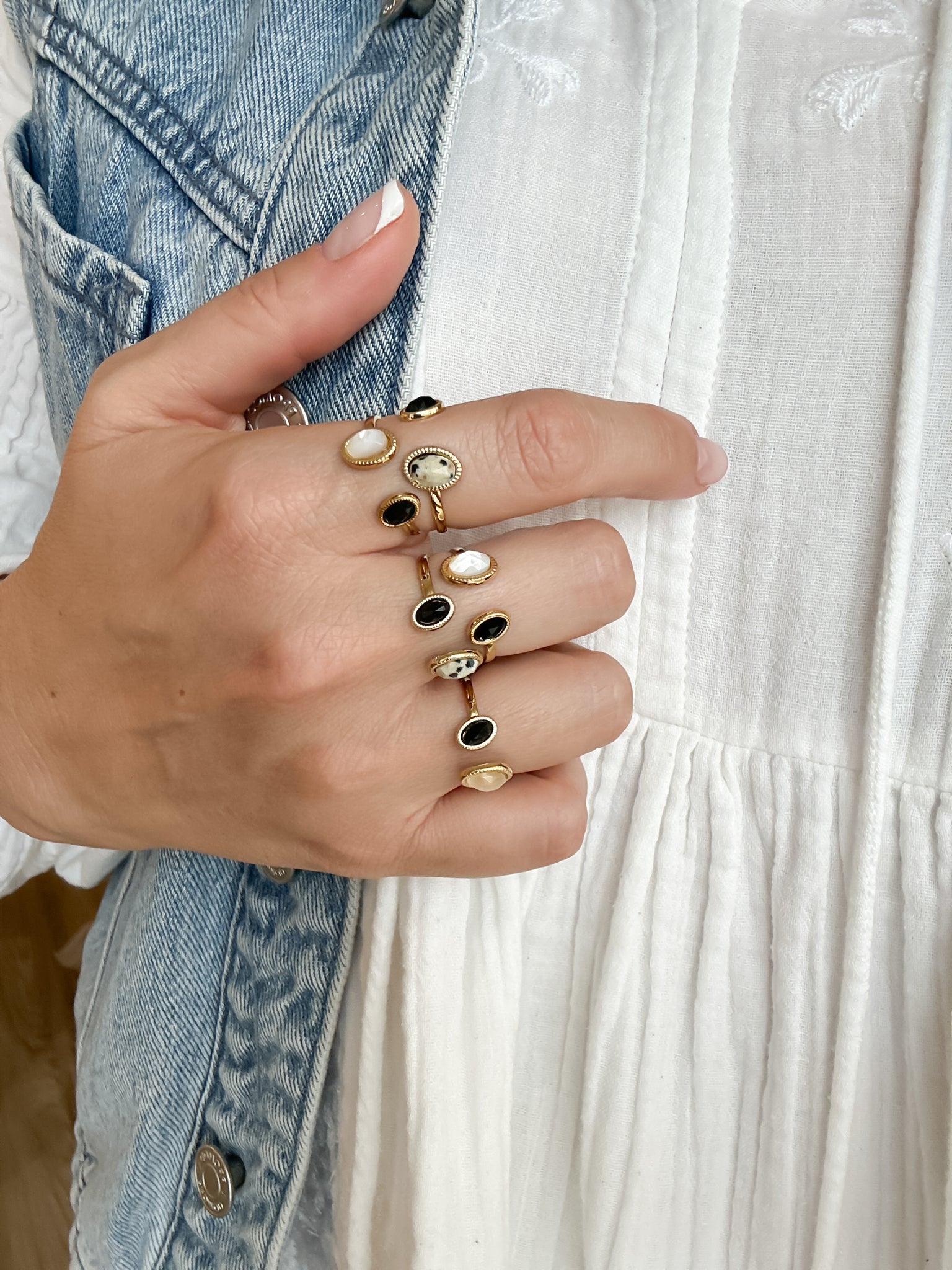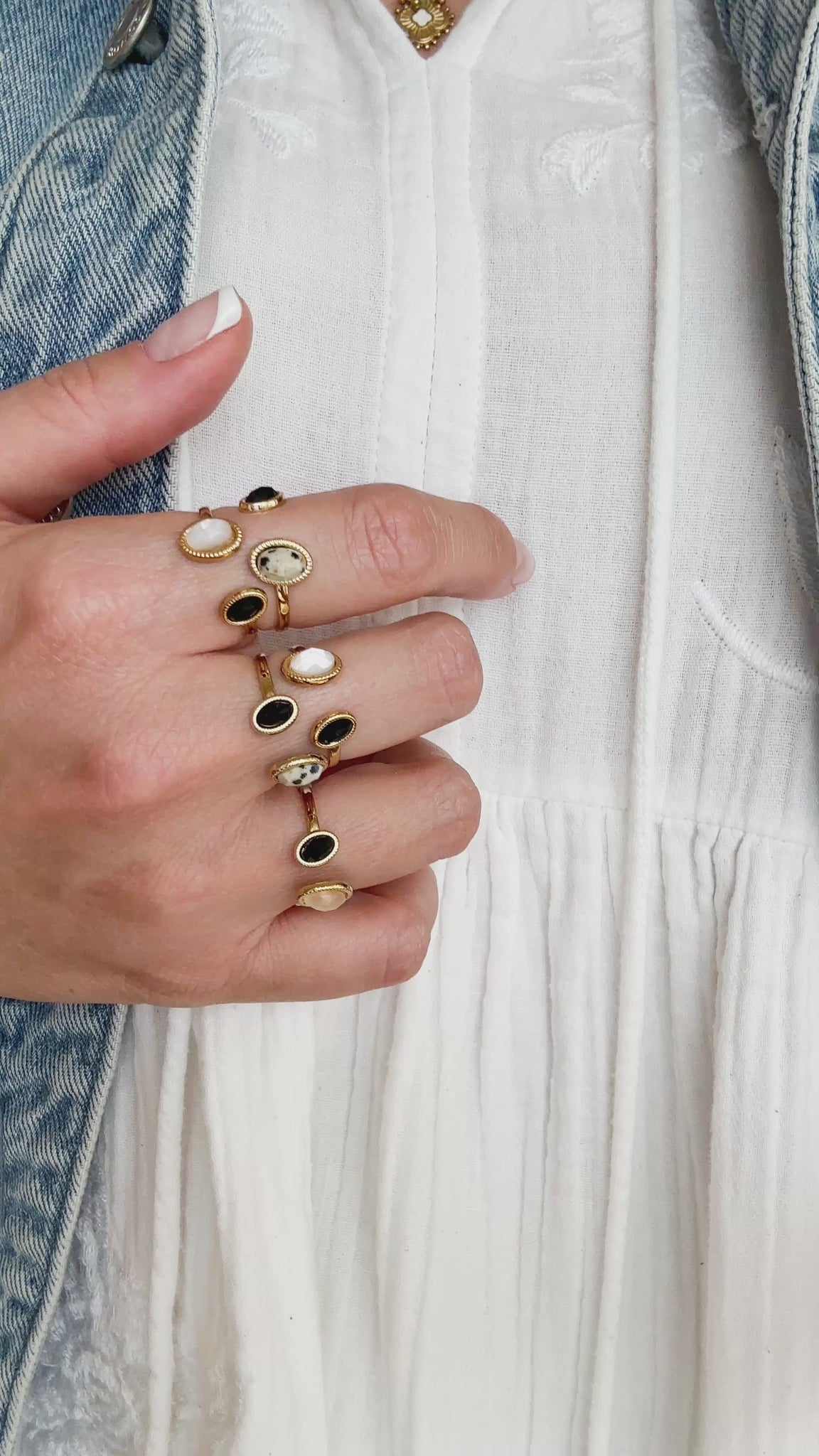- Bague ajustable composée de 2 rangs, 2 pierres naturelles gouttes, contour effet milgrain