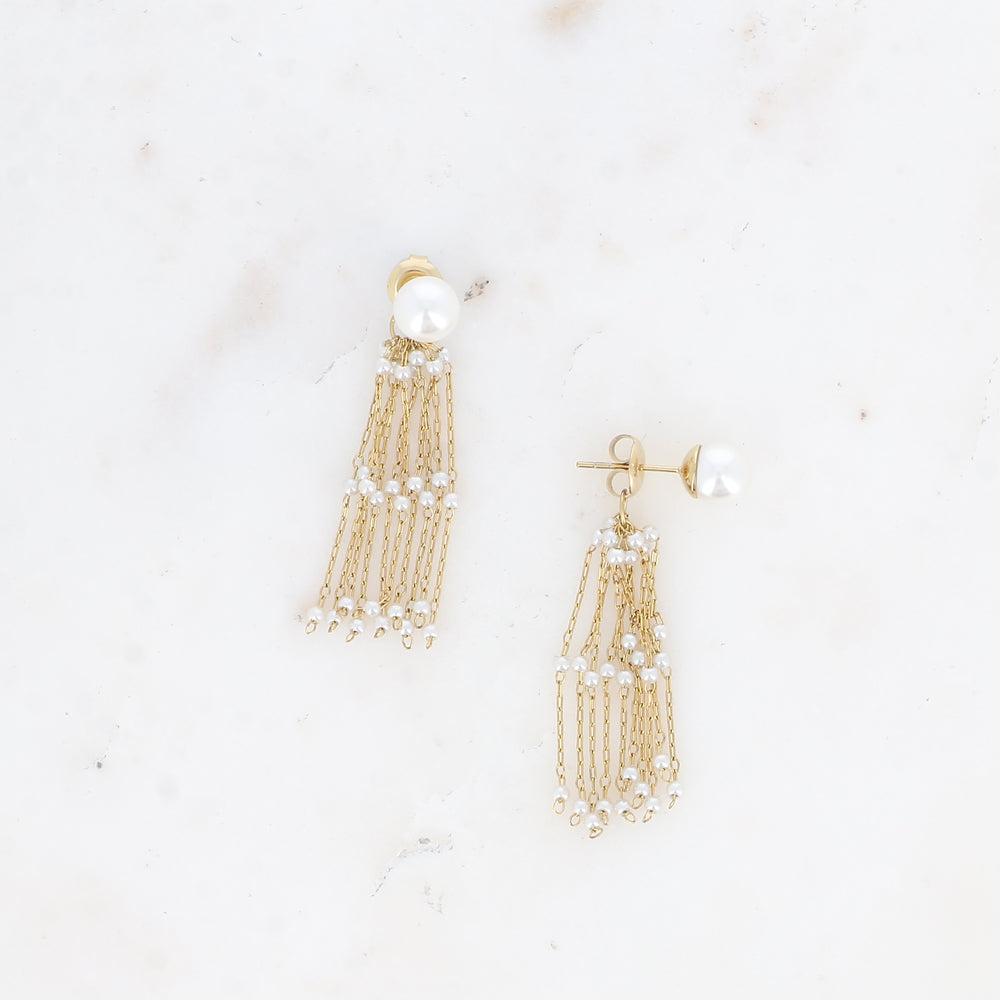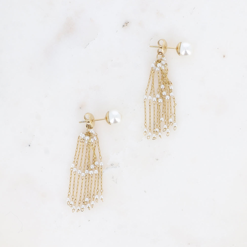 - Boucles d'oreilles à puce composées d'une perle de résine blanche, ainsi que de fines chaînes pendantes embellies par de petites perles de résine blanche accrochées sur le fermoir papillon