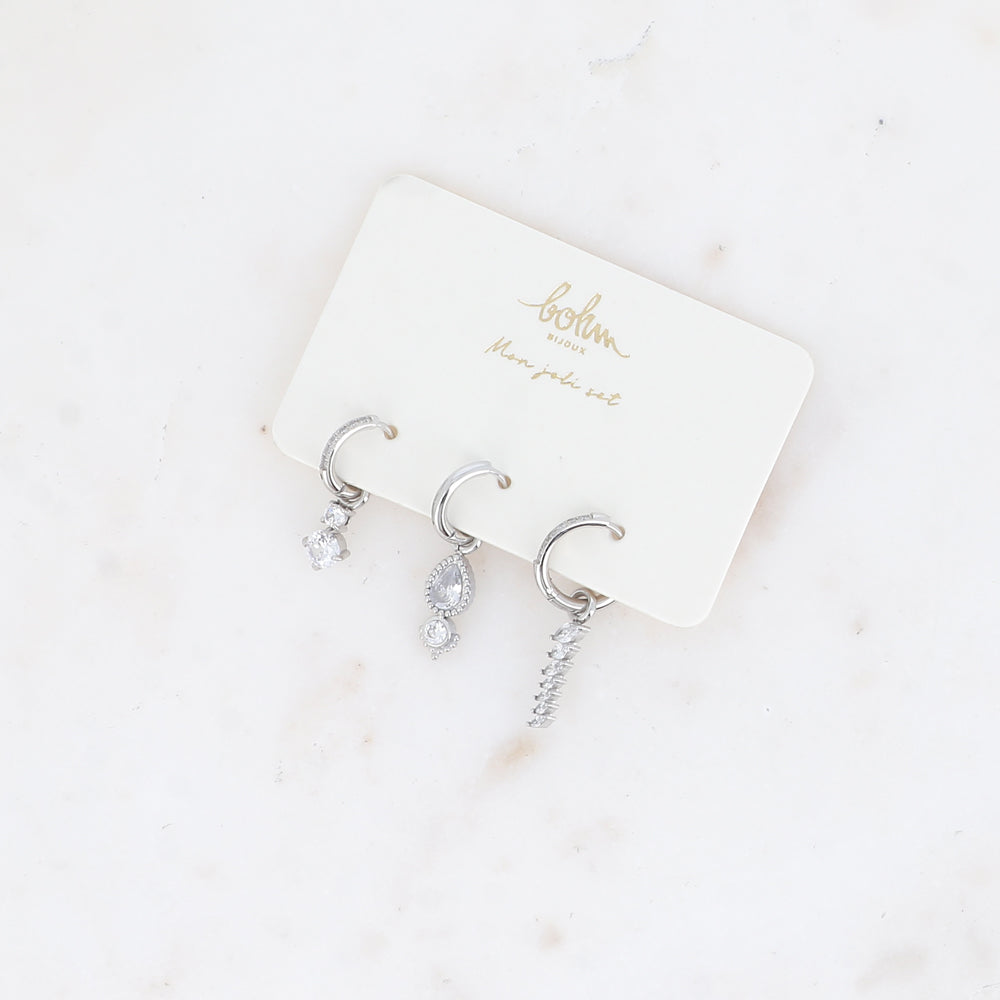- Set de 3 boucles type créoles avec fermoir, composées de motifs différents avec des cristaux.