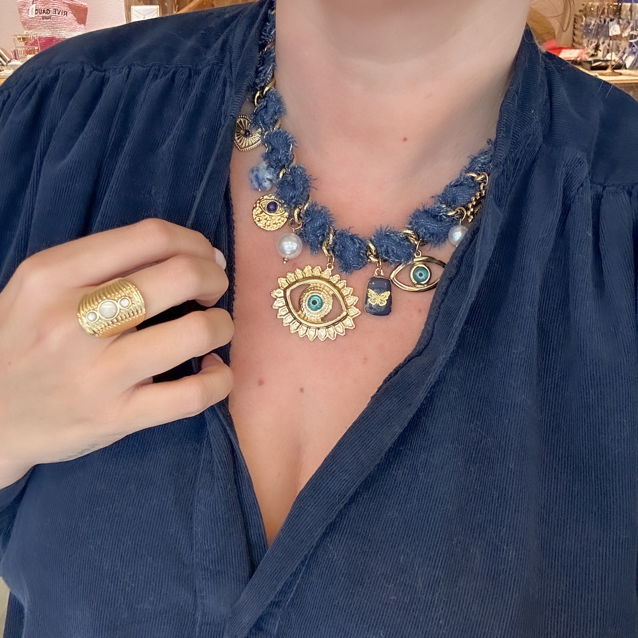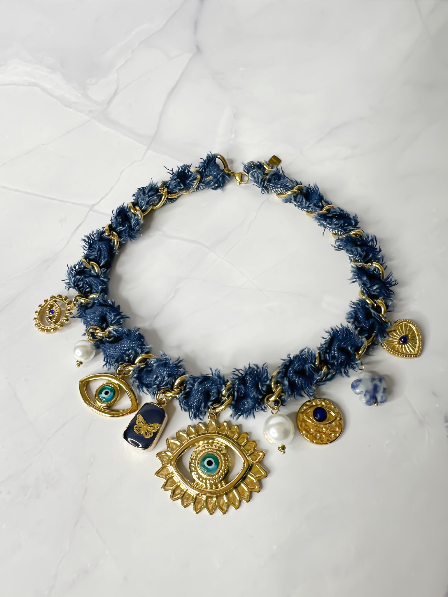 - Collier sur chaine et tissu jeans composé de pièce et pendentifs : œil protecteur émaillé, cœur gravé, perle, médaillons texturés.