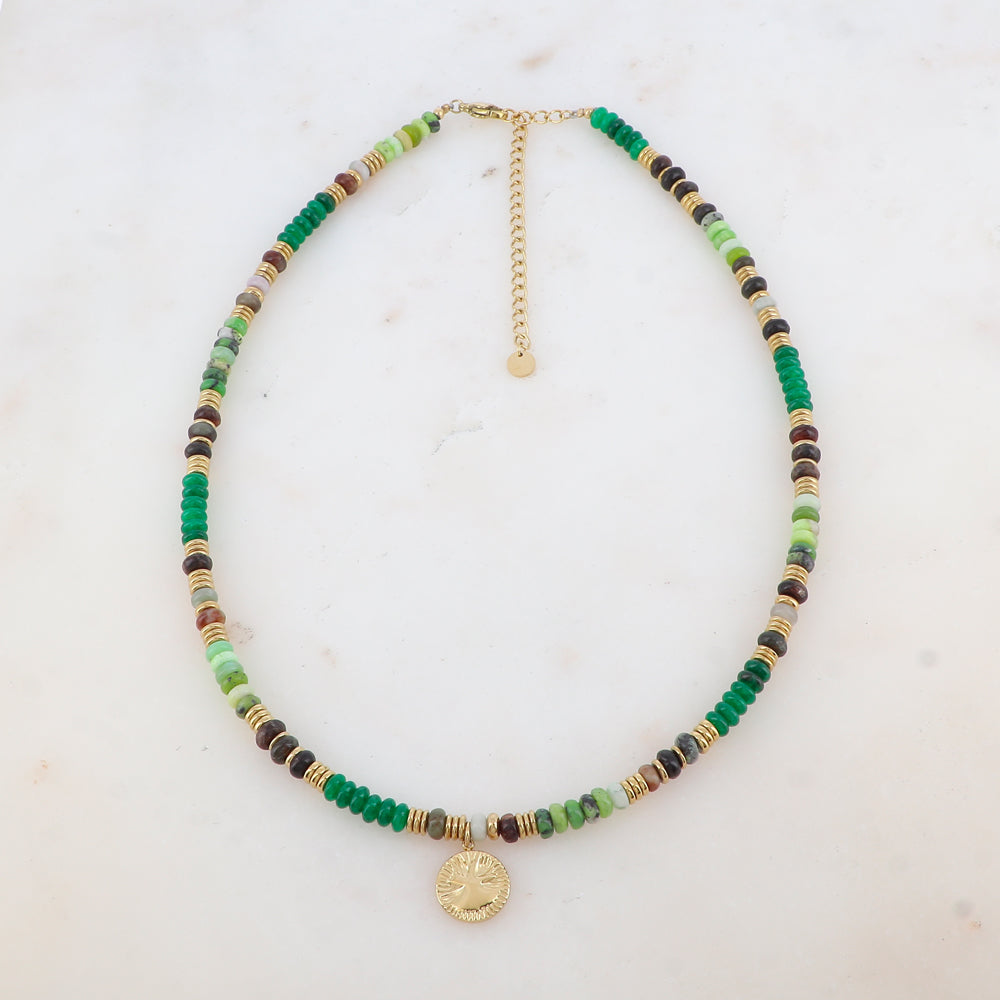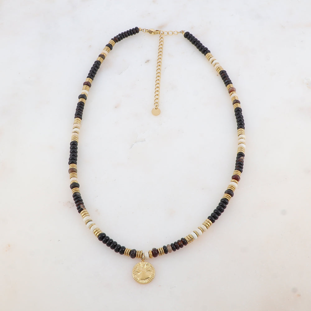 - Collier sur chaîne embelli de perles en pierre naturelle et d'un pendentif rond.