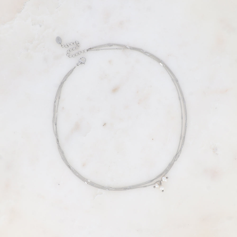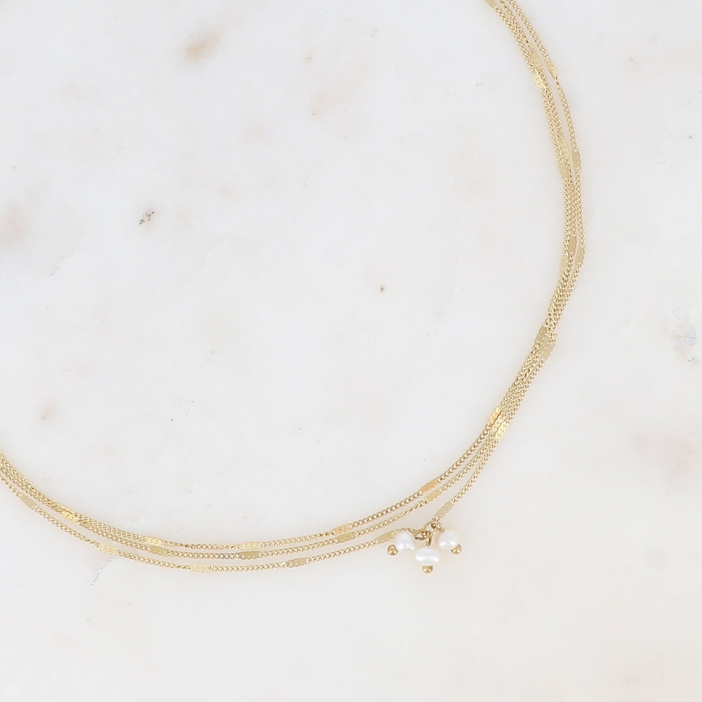 - Collier sur chaîne composé de 3 mailles forçat alternée et d'un pendentif de 3 petites perles d'eau douce.