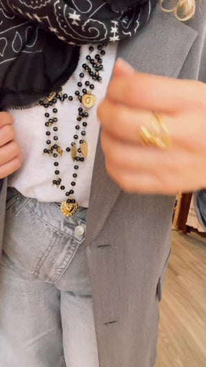 - Collier triple composé de fines perles en résine, il s’orne de pendentifs dorés en forme de cœur.
