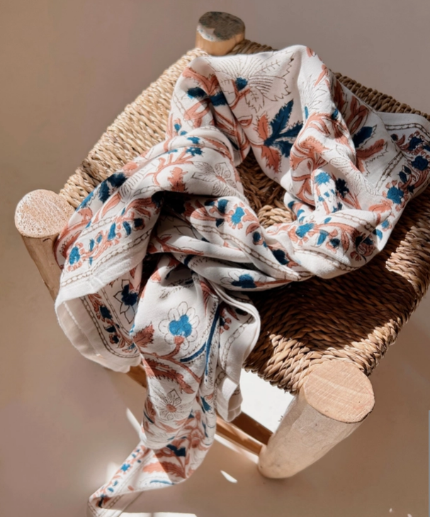 - Il est confectionné artisanalement grâce à la technique indienne du block-print, les couleurs sont réalisées à partir de pigments naturels.