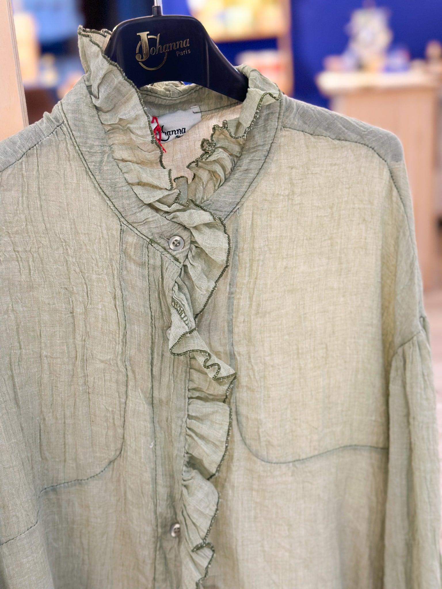 L’iconique chemise avec son volant le long de la boutonnière et aux manchesDouce matière et fluide 80 % polyester et 20 % coton