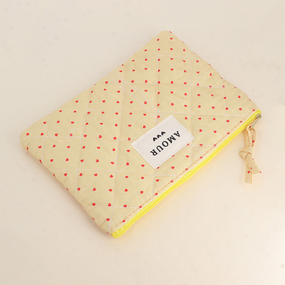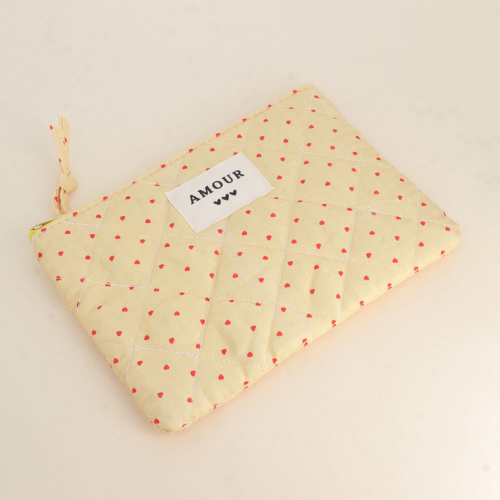 - Trousse multi-usages, pratique pour y ranger tout type d'affaires (toilettes, maquillage etc.) avec son pompon décoratif. Des petits coeurs sont brodés sur le dessus de la trousse en velours côtelé et de jolis motifs floraux ou de petits carreaux sont imprimés à l'intérieur de la trousse.