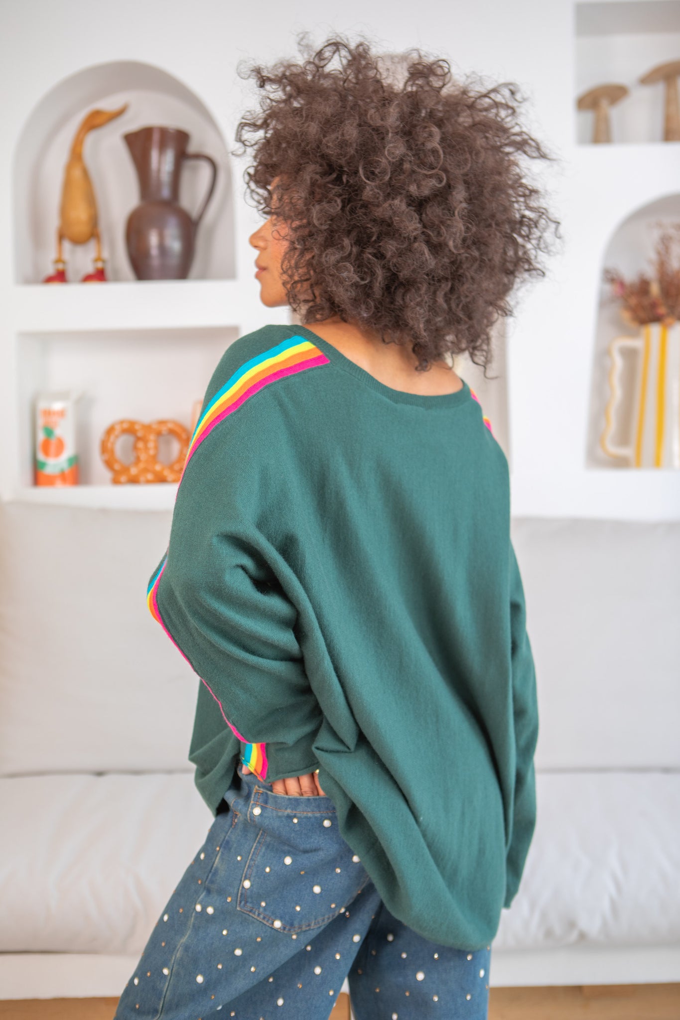 Le Pull CAPUCINE séduit par sa maille douce qui enveloppe avec une sensation de confort inégalée. Sa coupe décontractée et son col en V offrent une silhouette élégante tout en assurant une grande liberté de mouvement au quotidien. Les bandes multicolores arc-en-ciel sur les manches ajoutent une note originale et pleine de vitalité, parfaite pour dynamiser vos tenues avec une touche unique.