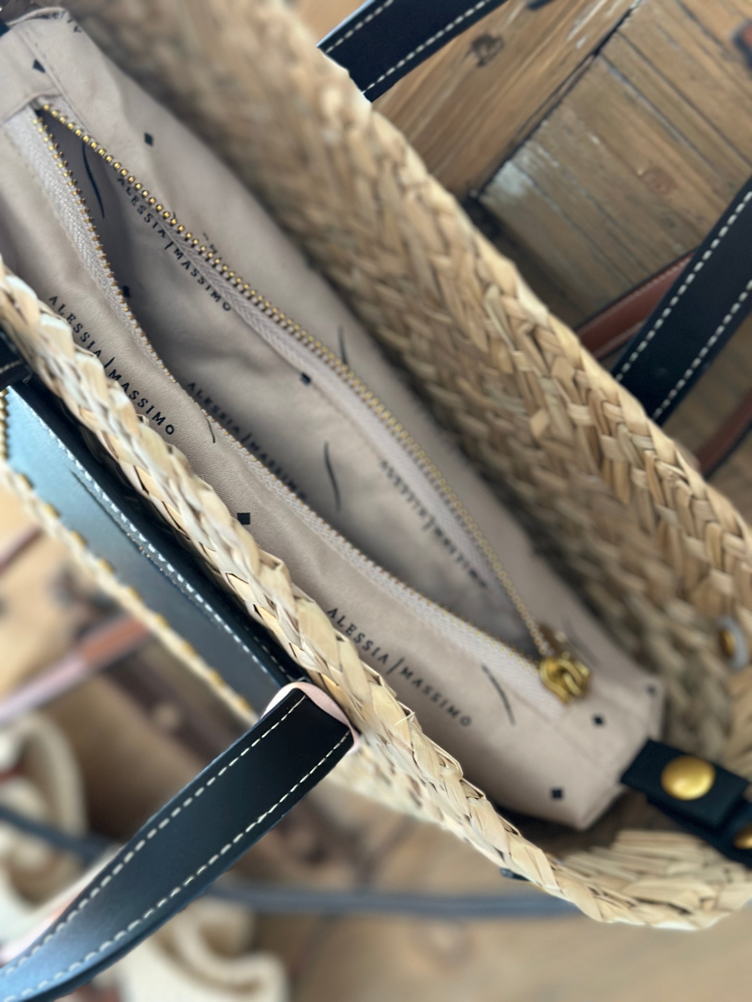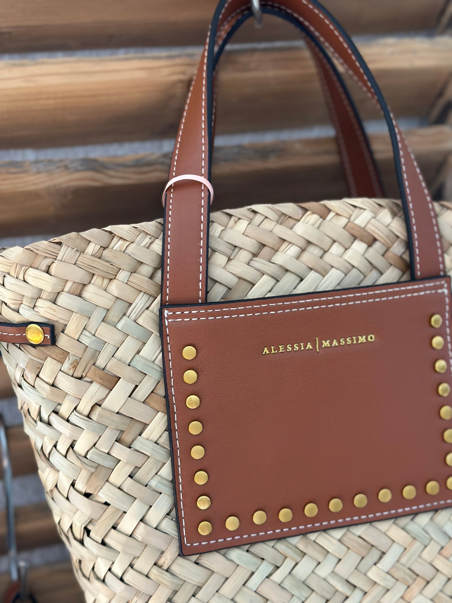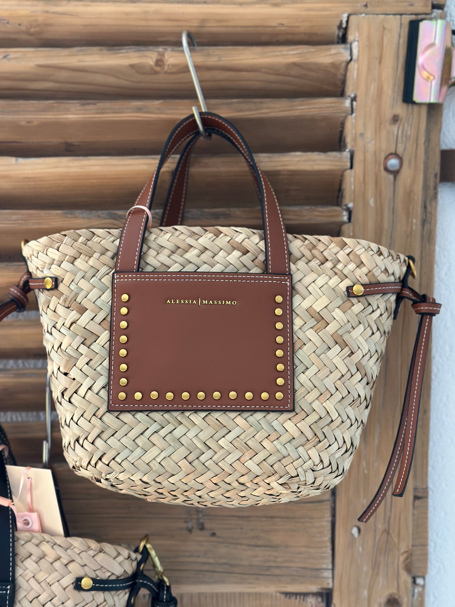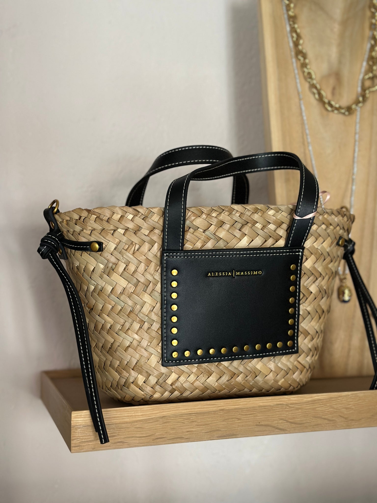 Découvre ce panier revisité dans une version chic et contemporaine, associant un tressage en paille naturelle à des finitions en cuir vegan sublimées par de délicats clous dorés. Son format structuré, ses anses courtes et sa longue bandoulière amovible en font un modèle aussi élégant que pratique, parfait du quotidien aux escapades estivales.