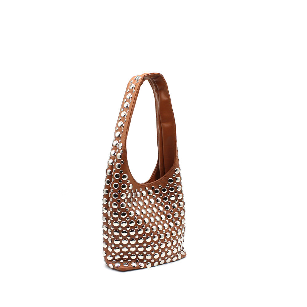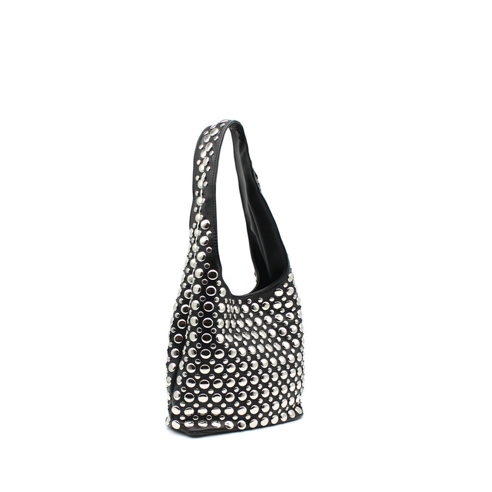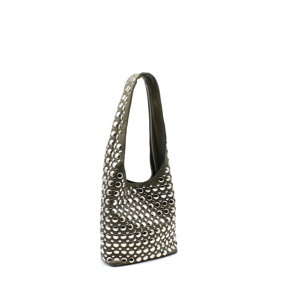 Découvre ROSA, un sac en cuir vegan souple entièrement rehaussé de clous argentés, pour une allure à la fois audacieuse et sophistiquée. Un modèle au caractère rock chic, pensé pour celles qui aiment les accessoires qui font la différence.